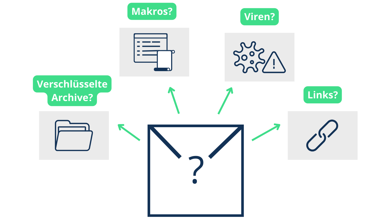Teil der SecuMail-Sicherheitsprüfung ist die Detektion von Viren, ausführbaren Dateien, unerwünschten Anhängen, Skriptsprachen und Makros in Dokumenten. Außerdem die Prüfung von Links auf betrügerische Websites. Dieser umfassende Prozess gewährleistet die Sicherheit Ihrer Kommunikation und schützt Sie vor potenziellen Bedrohungen.