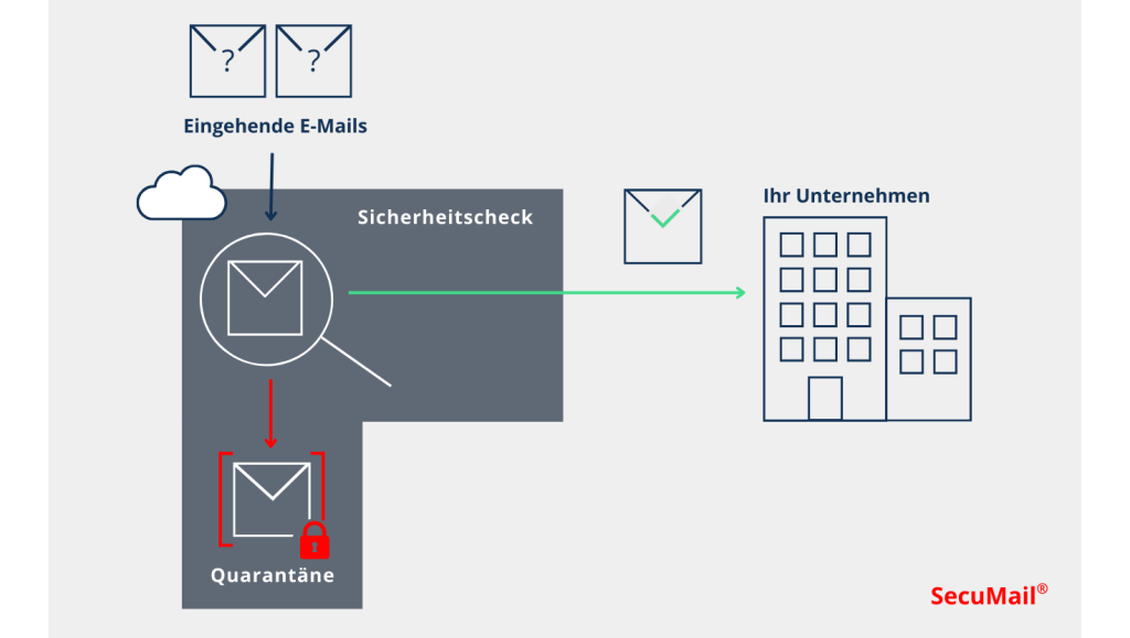 SecuMail wird über den MX-Eintrag in Ihre Firmen-Infrastruktur integriert. Nach erfolgreicher Umstellung prüfen die SecuMail-Server die Mails und stellen sie entweder in Quarantäne oder liefern sie direkt an Ihren Mailserver aus.