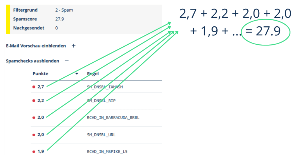 Unser Ziel im Bereich Spam-Filterung ist es, vor menschlichen Fehleinschätzungen (z.B. durch Social Engineering) zu schützen und gleichzeitig die Anzahl der fälschlicherweise gefilterten E-Mails gering zu halten. Dies erreichen wir durch die Verwendung von mehreren tausend Tests, welche verschiedene Merkmale bewerten und entsprechende Punkte vergeben. Die Summe dieser Punkte bildet den Spam-Score, welcher letztendlich darüber entscheidet, ob die E-Mail als Spam zurückgehalten oder an den Empfänger ausgeliefert wird.